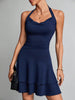 Summer Occasions Ready: This navy blue halter neck dress with a flounce hem is versatile for various summer events, from casual outings to evening gatherings.