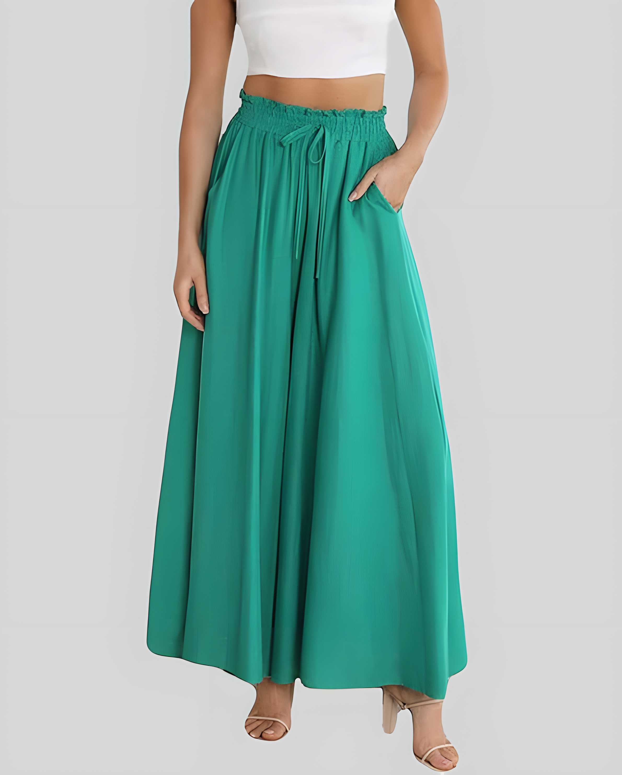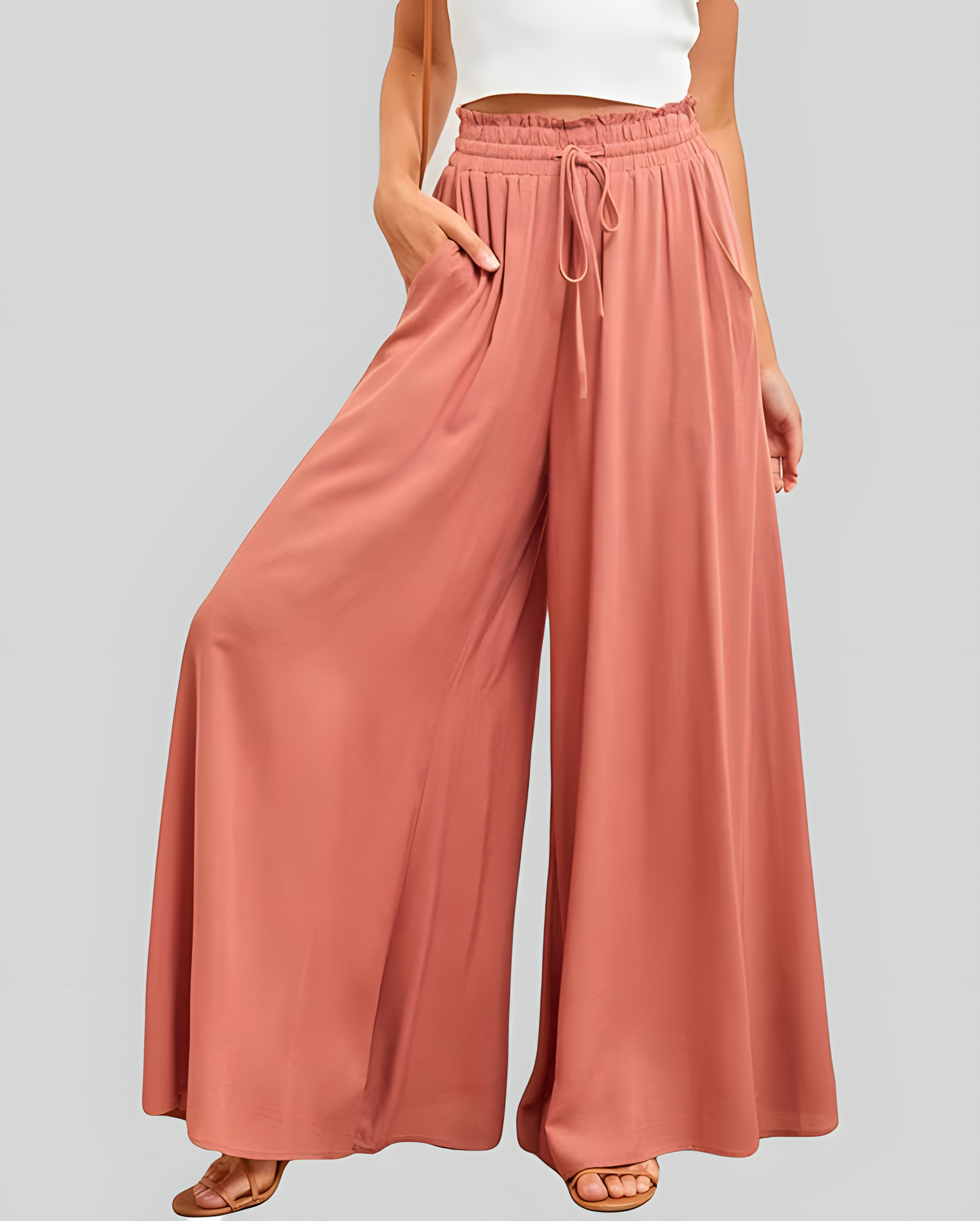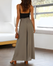 【Design】- High waist with ruffles and drawstring, 2 side pockets, wide leg, solid color, loose fit.